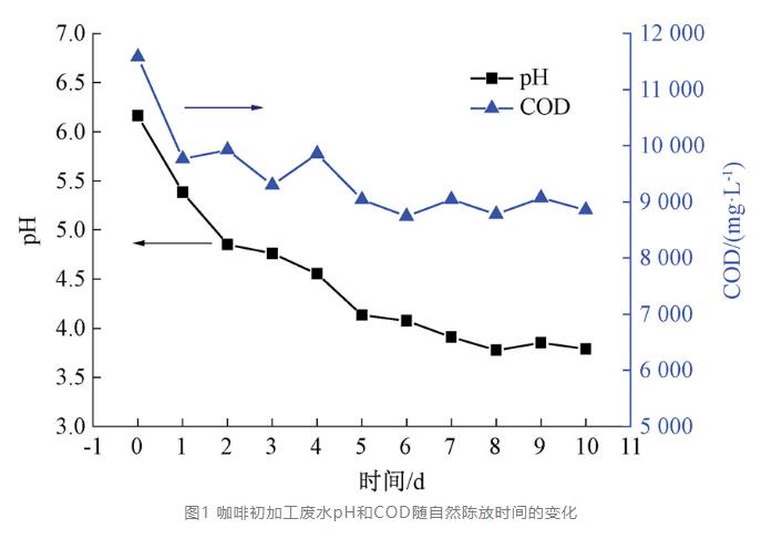 为了解该废水酸化及污染变化特点,研究选取咖啡加工混合水样,对废水pH和COD随时间的变化进行分析,结果如图1所示。咖啡加工废水特征为高有机物浓度、SS和氨氮,果胶多为可溶性果胶,COD主要于溶解态存在,颗粒、悬浮态约占比2 000~4 000mg/L,有机物易酸化导致废水呈酸性,pH范围为3~5。