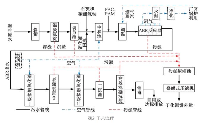 (2)咖啡初加工废水总体上属于可生化性废水,其净化应考虑预处理+厌氧消化+好氧氧化+三级处理的净化工艺路线。依据其路线,结合工程实际案例,采用斜筛筛分去壳-混凝沉淀-中和-调温-ABR厌氧消化产气-二段生物接触氧化-高效混凝沉淀-次氯酸钠消毒组合工艺,可有效去除污染物,出水水质稳定达标。