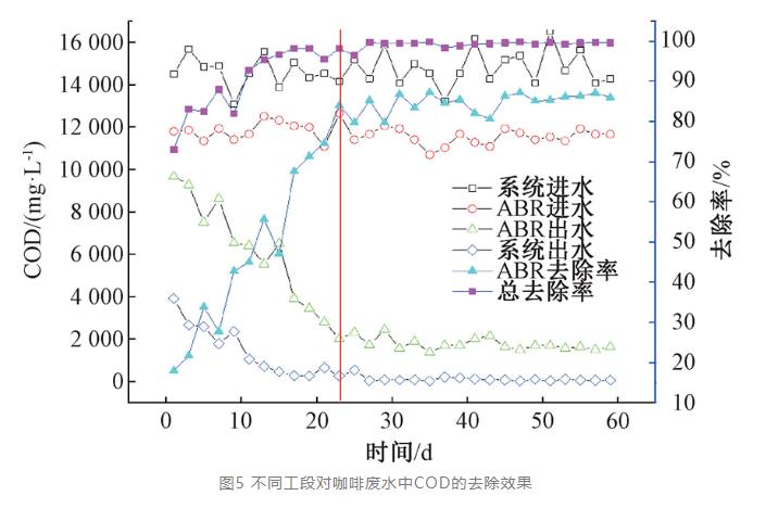 在调试期间,废水经多次循环回流后,进入调节池长时间储存,稳定其水质水量,降低有机负荷,待ABR反应池启动完成后,再进行处理。且初期调试时间较长,待调试完成后,后续启动可在1个月内完成。此外,咖啡果实成熟时间不同,前期咖啡废水量较少,可以在调节池中储存一段时间,且实际运行中,污水处理厂一般通过预留废液,在咖啡采收加工前进行启动工作,为后续废水处理奠定基础。
