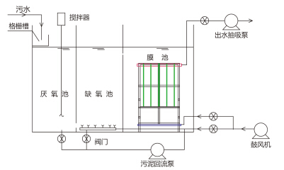 膜生物反应器(Membrane Bioreactor,MBR)是一种将高效膜分离技术与传统活性污泥法相结合的新型高效污水处理工艺,它用具有独特结构的浸没式膜组件置于曝气池中,经过好氧曝气和生物处理后的水,由泵通过滤膜过滤后抽出。它与传统污水处理方法具有很大区别,取代了传统生化工艺中二沉池和三级处理工艺。由于膜的存在大大提高了系统固液分离的能力,从而使系统出水水质和容积负荷都得到大幅度提高,出水可达到杂用水标准。